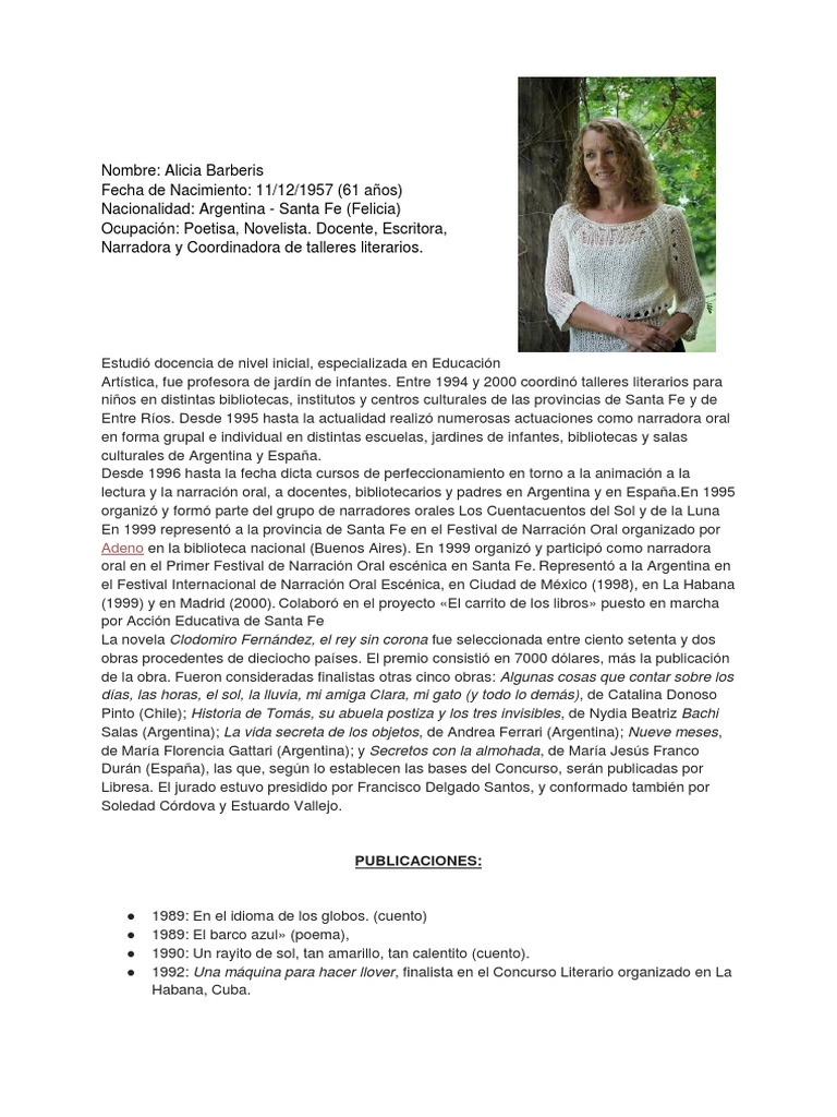 Alicia barberis biografia resumida. Muchas de ellas se encuentran entre las primeras en abordar ciertas temticas difciles. Profile von Personen mit dem Namen Alicia Barberis anzeigen. Alicia Barberis es una escritora y narradora oral.