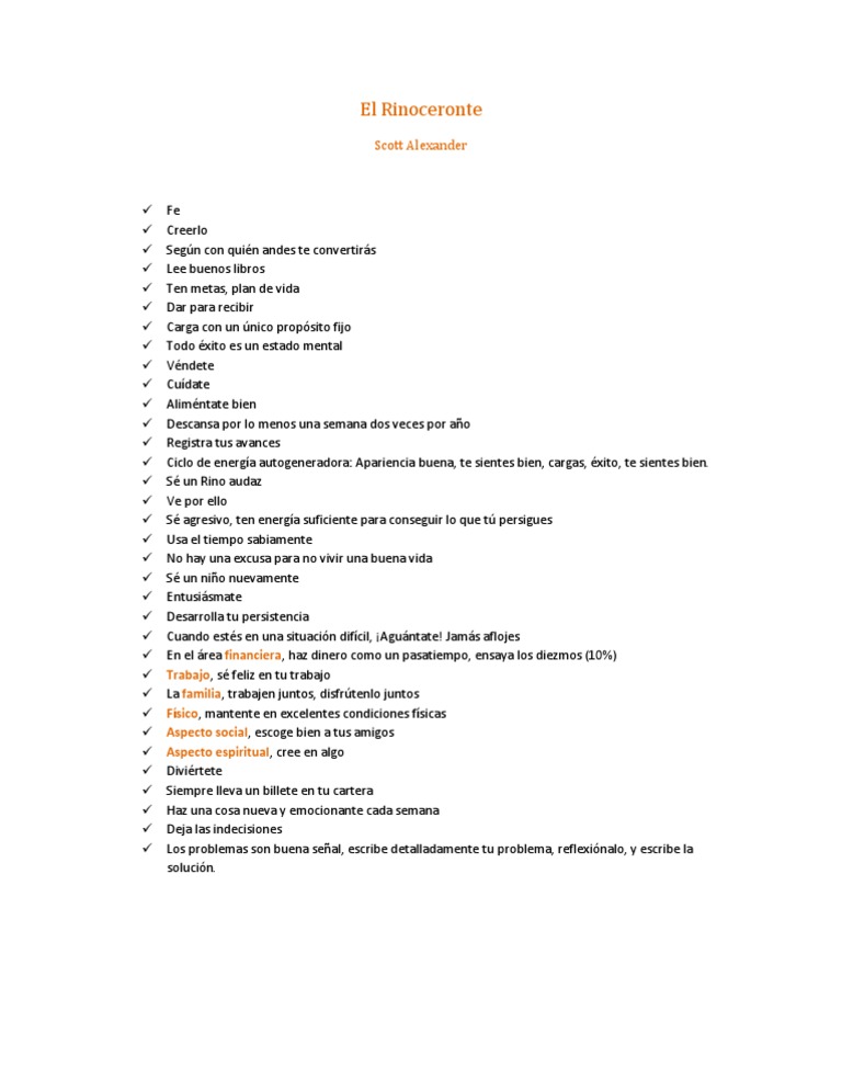 Resumen del libro El Rinoceronte Resumen de El RinoceronteResumen de el libro El Rinoceronte de Scott AlexanderEl libro nos trata de mostrar la forma de alcanzar el xito las actitudes y hbitos que debemos tomar para avanzar hacia l y lograr tenerlo. Sin embargo El Rinoceronte me pareci un poco cansino. Nunca te relajes porque el momento menos esperado llega la tormenta de problemas y si no ests preparado muy seguramente naufragars en ella.