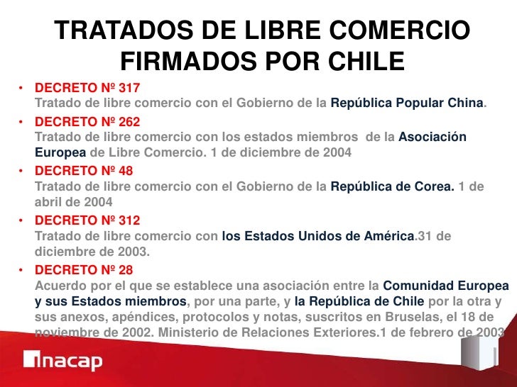El Anexo I al artculo 3-04 establece el Programa de Desgravacin cuyo principio general establece que el universo. A la fecha a travs de los tratados de comercio firmados Chile actualmente posee libre acceso a los principales. FORTALECER los lazos especiales de amistad y cooperacin entre sus naciones.