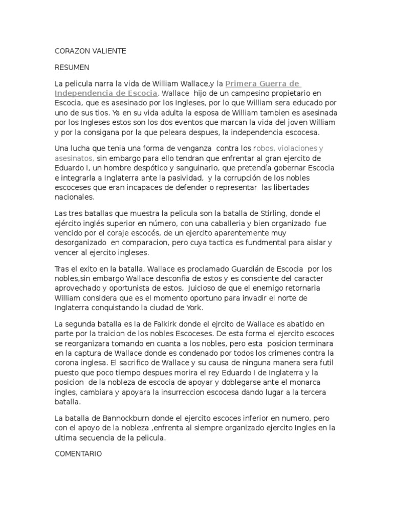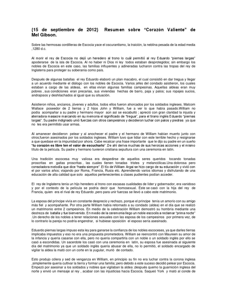 Corazon valiente pelicula resumen. Resumen protocolo x25 2406 palabras 10 pginas. 15 de septiembre de 2012 Resumen sobre Corazn Valiente de Mel Gibson. 1 Haga referencia al tiempo y al lugar en el que.