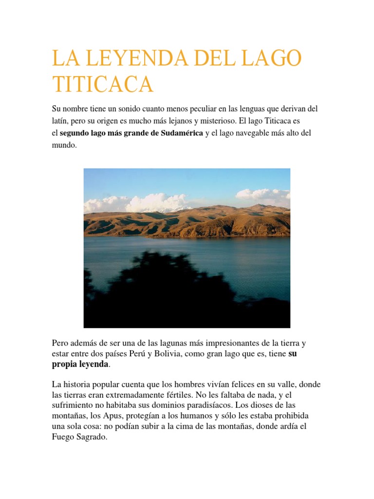 Haga un breve resumen de la leyenda del lago titicaca 2 Ver respuestas estrellys13 estrellys13 Respuesta. Cest le plus grand lac dAmrique du Sud en volume deau et en longueur mais pas en superficie. La leyenda del lago Titicaca dice que los hombres de estas tierras vivan su vida feliz donde no les faltaba ninguna cosa y vivan la vida sin sufrir.