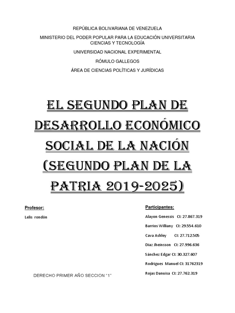 A travs de una Construccin colectiva la Universidad de las Ciencias de la Salud Hugo Chvez Fras pone al alcance de todos y todas los lineamientos para la discusin y el debate en las reas de Salud y Educacin que deben ser incorporados en el Plan de la Patria 2019-2025 los cuales deben orientarse a. El presente informe consiste en una revisin y anlisis resumido del Plan de la Patria 2019-2025 con exclusiva atencin a los lineamientos contenidos en dicho Plan para las universidades. Los cincos objetivos histricos es el segundo plan socialista que nos permitir avanzar y reimpulsar la ruta de la transicin al Socialismo Bolivariano del siglo XXI los cuales vamos a desarrollar ms adelante.