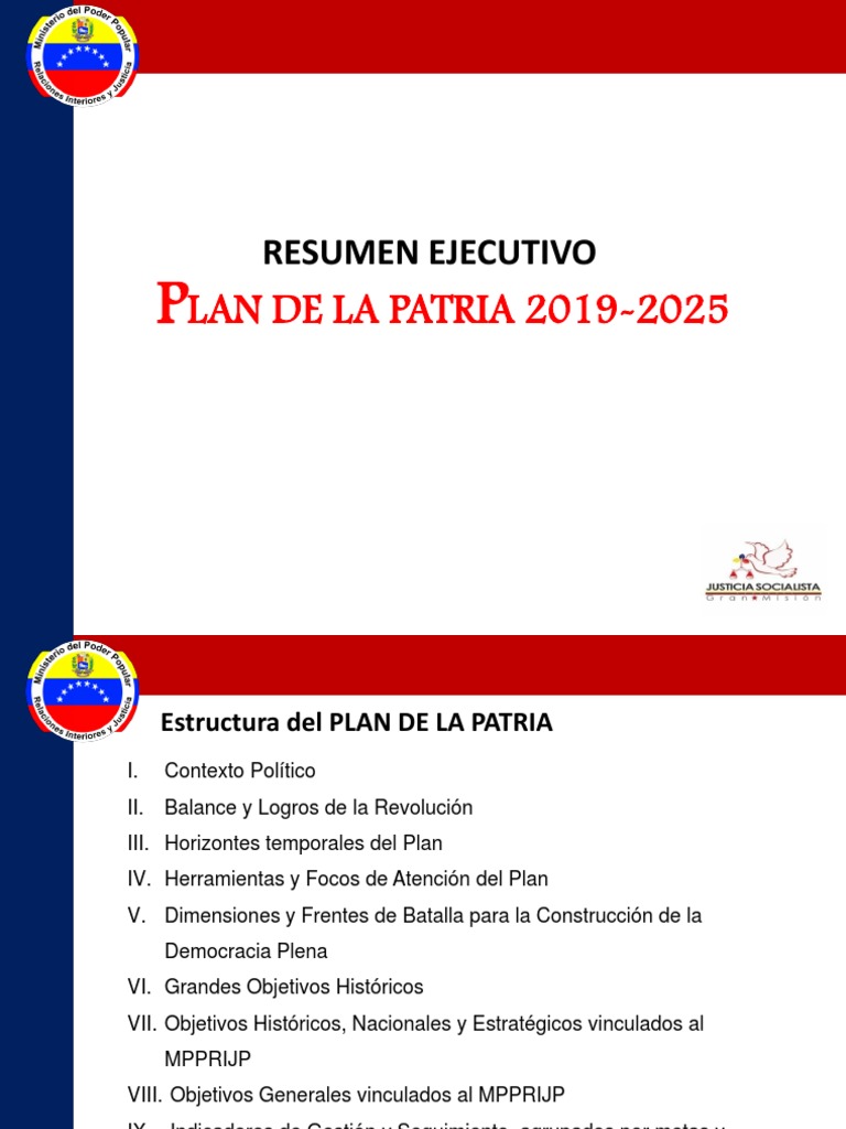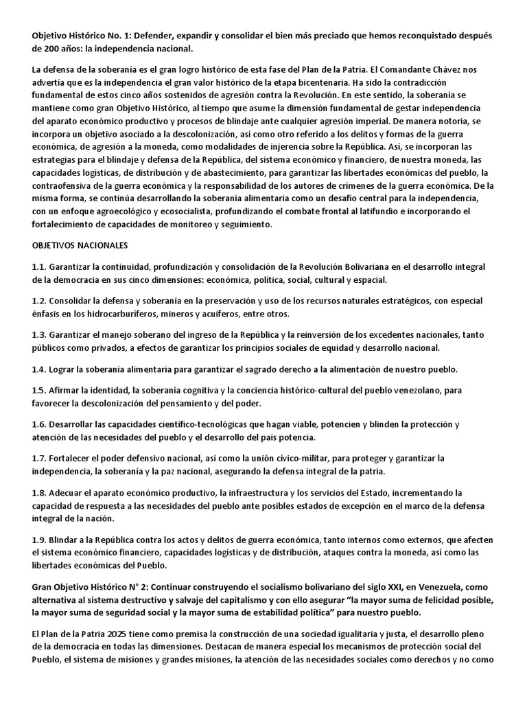 Caracterizacin de los cinco objetivos histricos. Resumen plan de la patria 2019-2025 El Plan de la Patria 2019-2025 es un documento por el cual se plantea objetivos para la consolidacin del socialismo en Venezuela est desglosado en objetivos fundamentales y objetivos histricos para su discusin y debate en todo el territorio nacional. El Plan de la Patria.