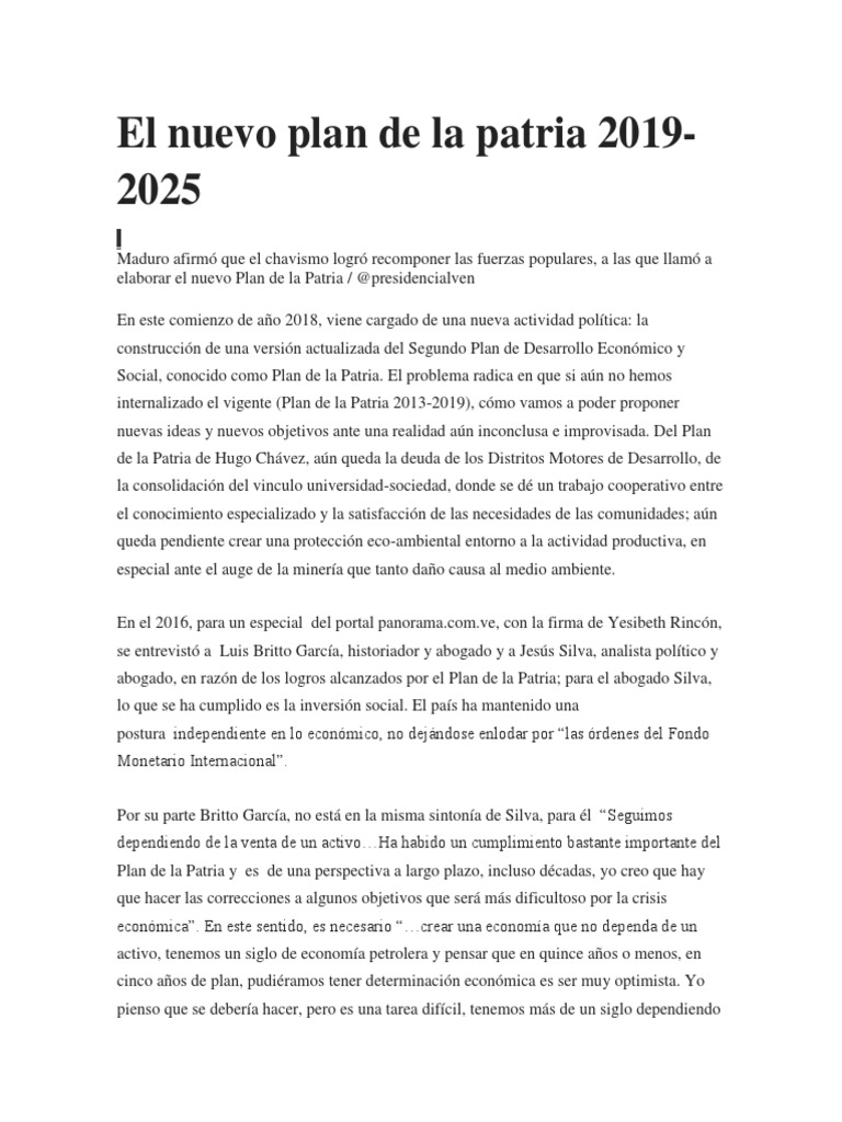 El Plan de la Patria 2019-2025 es un documento por el cual se plantea objetivos para la consolidacin del socialismo en Venezuela est desglosado en objetivos fundamentales y. El presidente de Venezuela Nicols Maduro present su programa de Gobierno Plan de la Patria 2019-2025 ante la Asamblea Nacional Constituyente ANC. Luego de su fallecimiento el presidente Nicols Maduro present el Plan de la Patria ante la Asamblea Nacional de Venezuela en 2013 siendo aprobado el 3 de diciembre y publicado al da siguiente el 4 de.