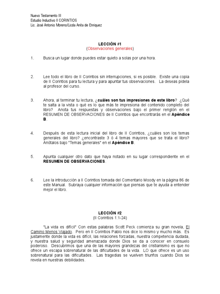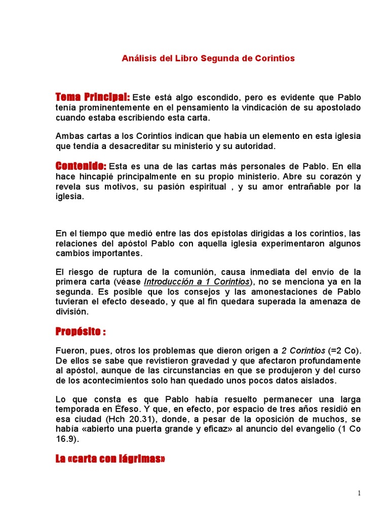La segunda carta a los corintios es menos conocida que la primera la primera es una unidad mucho ms didctica y va presentando los temas uno por uno. Cartas de recomendacin 1-3 Ministros del nuevo pacto 4-6. Un registro de esta visita y el establecimiento de la iglesia se encuentra en Hechos 181-18.