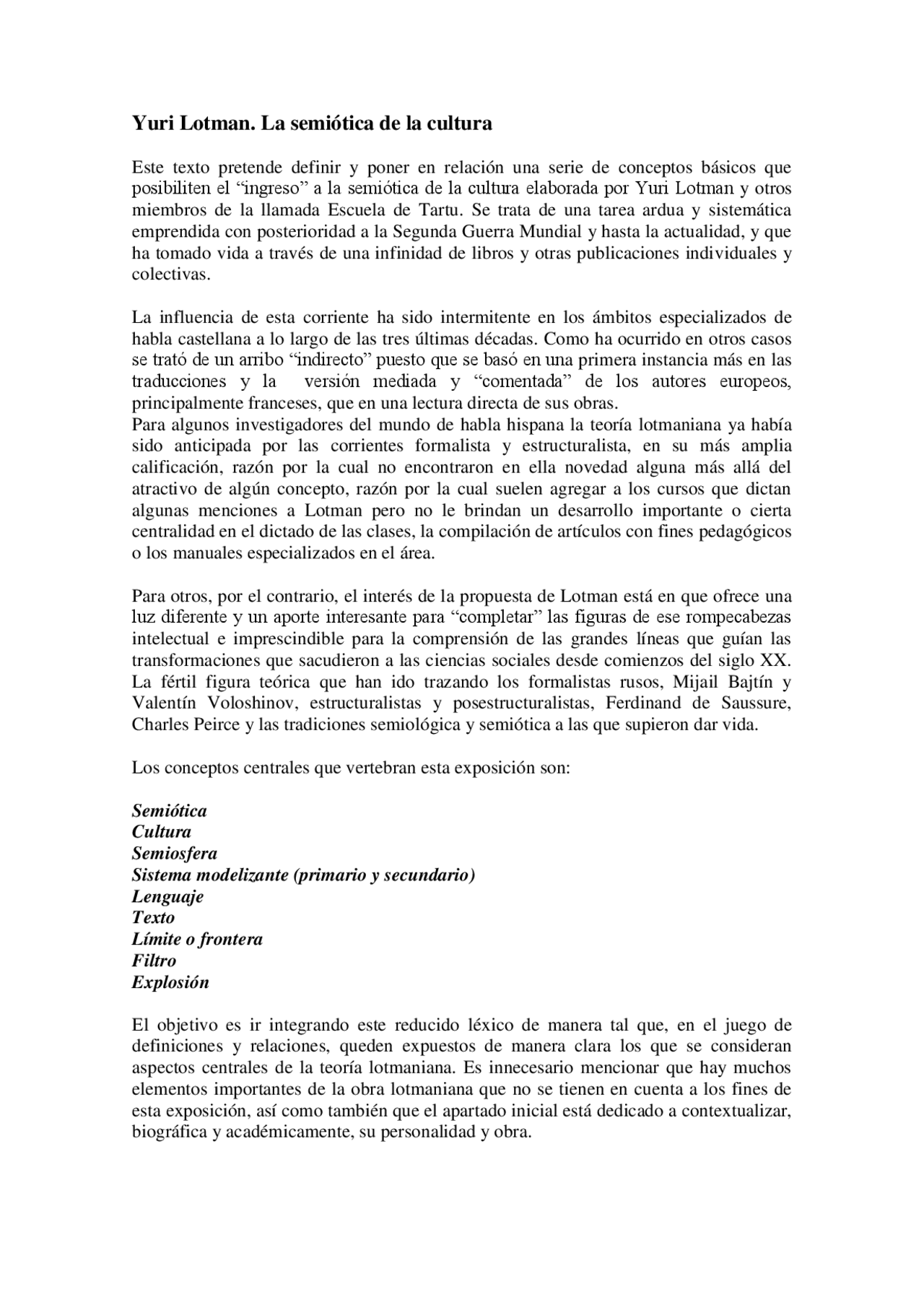 Eso s el trmino aparece en los. Iuri Mijailovich Lotman 1922-1993 was an investigator of Tartu University Estonia with a recognized international trajectory whose contributions in the field of the Semiotics of Culture extended the borders of the then so called Soviet Union in spite of the difficulties and censorships imposed by the communist government to the diffusion of their work. La semitica de la cultura y el concepto del texto.